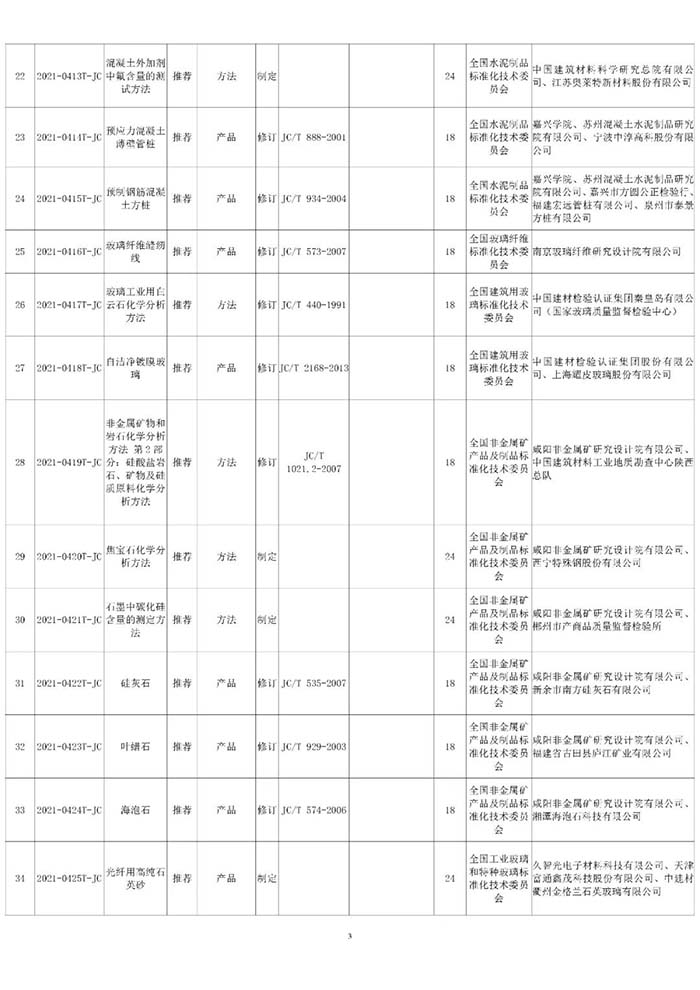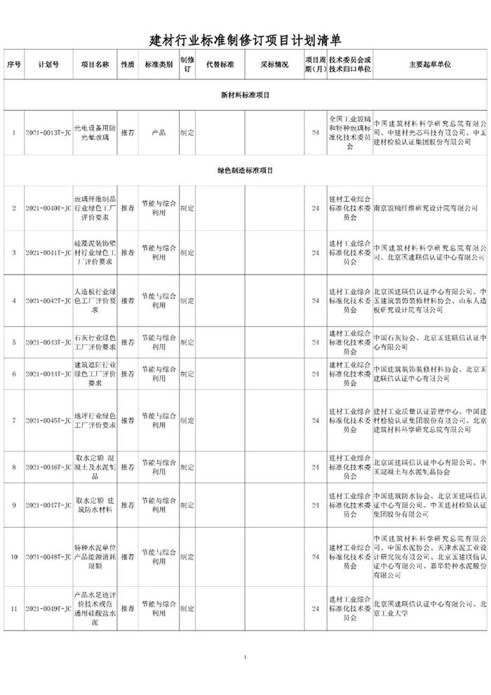 工業和信息化部辦公廳近日印發了2021年第一批行業標準制修訂和外文版項目計劃(工信廳科函〔2021〕25號),本批行業標準制修訂項目計劃共521項,其中,由中國建筑材料聯合會提出的共有45項(見附表)。