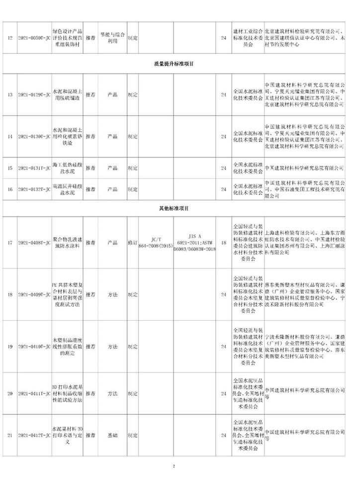 工信部本批下達的建材行業標準計劃主要涉及新材料專項1項、綠色制造專項11項、質量提升專項4項、外文版項目3項、其他項目26項。標準的研制將有助于完善建材行業標準體系,推動我國建材工業轉型升級;在標準國際化方面,三項標準外文版計劃的成功立項,將有助于產品進出口貿易,助力“國內國際雙循環”的新發展格局,推動我國建材產業“走出去”,提升國際影響力和競爭力。同時,本批計劃涉及13項修訂項目,標準的及時修訂將有助于提高現有標準技術水平,滿足行業高質量發展需求。