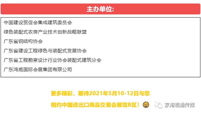 為了推進裝配式建筑領(lǐng)域的廣泛合作,助力粵港澳大灣區(qū)建設(shè),由中國建設(shè)貿(mào)促會集成建筑委員會、綠色裝配式農(nóng)房產(chǎn)業(yè)技術(shù)創(chuàng)新戰(zhàn)略聯(lián)盟、廣東省鋼結(jié)構(gòu)協(xié)會、廣東省建設(shè)工程綠色與裝配式發(fā)展協(xié)會、廣東省工程勘察設(shè)計行業(yè)協(xié)會裝配式建筑分會、廣東鴻威國際會展集團有限公司等聯(lián)合主辦的,將于5月10-12日在中國進出口商品交易會展館B區(qū)11.1-10.1號館隆重舉辦,本屆吸引了近300家優(yōu)質(zhì)工程總承包供應(yīng)鏈企業(yè)展示先進技術(shù)和產(chǎn)品,覆蓋裝配式建筑開發(fā)建設(shè)、設(shè)計施工、集成房屋、部品部件、裝配式裝修、裝備制造等產(chǎn)業(yè)鏈上下游全領(lǐng)域。